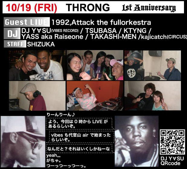 19 Throng -VIBES RECORD Presents- 1st Anniversary DJ Y∀SU (VIBES RECORD) TSUBASA KTYNG YASS aka Raiseone TAKASHI-MAN kajichatch(CIRCUS) STAFF: SHIZUKA Guest LIVE: 1992.Attack the fullorkestra Special Guest LIVE: 瘋癲(FU-TEN) |