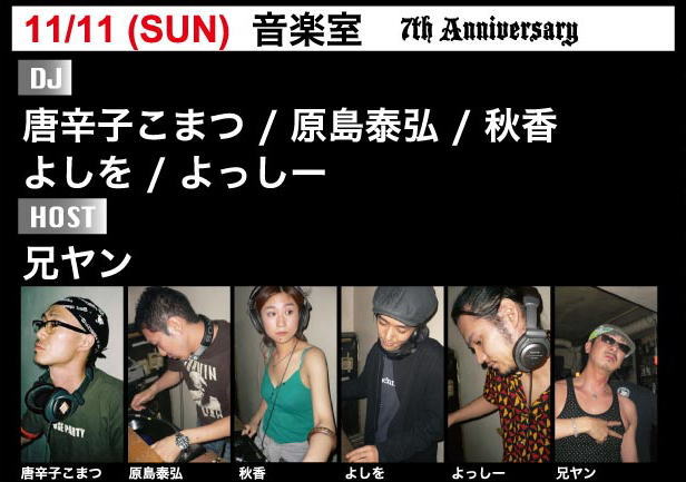 | 11 音楽室 7th Anniversary 唐辛子こまつ 原島泰弘 秋香 よしを よっしー HOST: 兄ヤン ※18:00-24:00 |