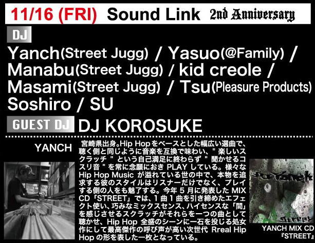 16 Sound Link 2nd Anniversary Yanch(Street Jugg) Yasuo(@Family) Manabu(Street Jugg) kid creole Masami(Street Jugg) Tsu(Pleasure Products) Soshiro SU Guest DJ: KOROSUKE |