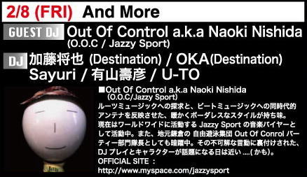 8 And More 加藤将也(Destination) OKA(Destination) Sayuri 有山壽彦 U-TO Guest DJ:Out Of Control a.k.a Naoki Nishida(Jazzy Sport) |