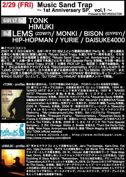 29 Music Sand Trap 〜1st Anniversary SP.vol1〜 LEMS(ZDW!?) MONKI BISON(GYPSY) HIP-HOPMAN YURIE DAISUKE4000 Guest DJ: TONK HIMUKI |
