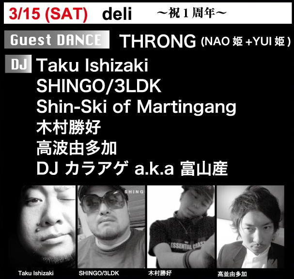 15 deli 〜祝1周年〜 Taku Ishizaki SHINGO/3LDK Shin-Ski of Martiangang 木村勝好 高波由多加 DJカラアゲa.k.a富山産 Guest DANCE: THRONG (NAO姫+YUI姫) |