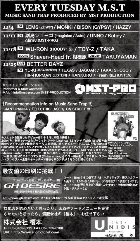 25 Music Sand Trap YU-KI (O-DA-9CIONERZ) TEXAS JAGUAR TAKAI SHOGO HIPHOPMAN (LISTEN) KANKURO Fresh 池田 (LISTEN) ...and more LIVE: BETTER DAYZ |