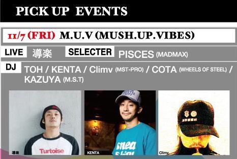 7 M.U.V (MASH.UP.VIBES) TOH KENTA climv(MST-PRO) COTA (WHEELS OF STEEL) KAZUYA(M.S.T) SELECTOR: PISCES(MADMAX) LIVE:導楽 |