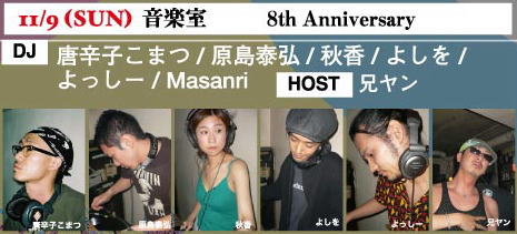 | 9 音楽室 〜8th Annniversary〜 唐辛子こまつ 原島泰弘 秋香 よしを よっしー Masanri HOST: 兄ヤン ※ |