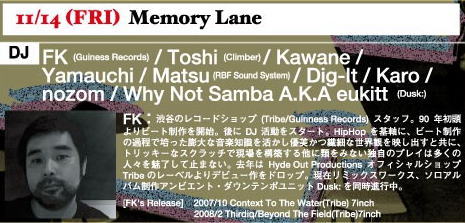 14 Memory Lane FK(Guiness Records) Toshi(Climber) Kawane Yamauchi Matsu(RBF Sound System) Dig-It Karo nozom Why Not Samba A.K.A eukitt(Dusc:) |