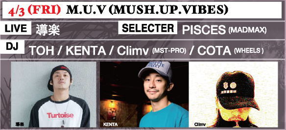 3 M.U.V (MASH.UP.VIBES) TOH KENTA climv(MST-PRO) COTA(WHEELS) SELECTER: PISCES(MADMAX) LIVE:導楽 |