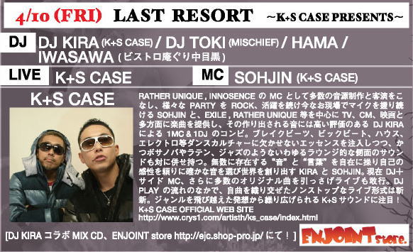 10 LAST RESORT DJ KIRA(K+S CASE) DJ TOKI(MISCHIEF) HAMA IWASAWA (ビストロ庵ぐり中目黒) MC:SOHJIN (K+S CASE) LIVE:K+S CASE http://www.crys1.com/ artisth/ks_case/index.html |