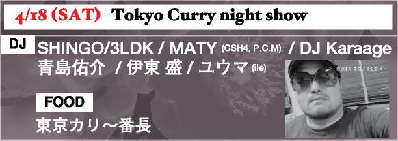 18 Tokyo Curry Night Show SHINGO/3LDK MATY(CSH4,P,C,M) DJ Karaage 青島佑介 伊東盛 ユウマ(ile) FOOD: 東京カリ〜番長 |