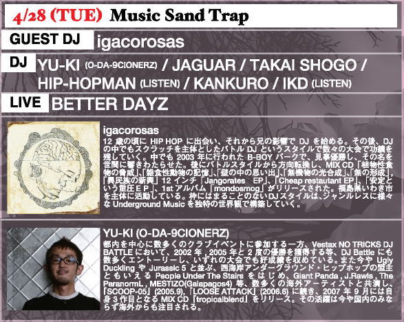 28 Music Sand Trap YU-KI (O-DA-9CIONERZ) JAGUAR HIPHOPMAN (LISTEN) KANKURO IKD(LISTEN) ...and more LIVE: BETTER DAYZ and more.. GUEST DJ: igacrosas |