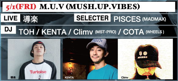 | ★ | ★ | ★ | ★ | ★ | 1 M.U.V (MASH.UP.VIBES) TOH KENTA climv(MST-PRO) COTA(WHEELS) SELECTER: PISCES(MADMAX) LIVE:導楽 |