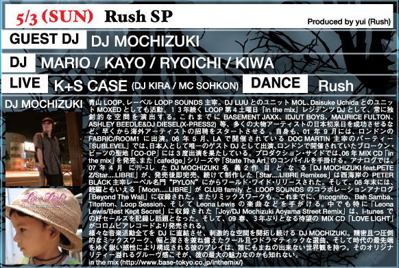 | 3 Rush SP MARIO KAYO RYOICHI KIWA LIVE: K+S CASE (DJ KIRA/MC SOHJIN DANCE: Rush GUEST DJ: DJ MOCHIZUKI Produced by yui | 4 JISCO DAZZ G,W SP Mr.Jisco Daddy Terra Takemichi and more.. HOSTESS: maiko | 5 Music Sand Trap (T.M.N.[TOKYO MUSIC NETWORK]) LEMS(ZDW!?) HAZZY MONKI Sounguage LIVE: パルコ&MONKI ...and more GUEST LIVE: Astro |