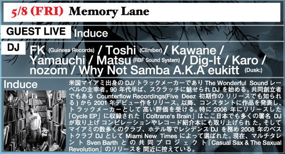 8 Memory Lane FK(Guiness Records) Toshi(Climber) Kawane Yamauchi Matsu(RBF Sound System) Dig-It Karo nozom Why Not Samba A.K.A eukitt(Dusk:) GUEST DJ: Induce |