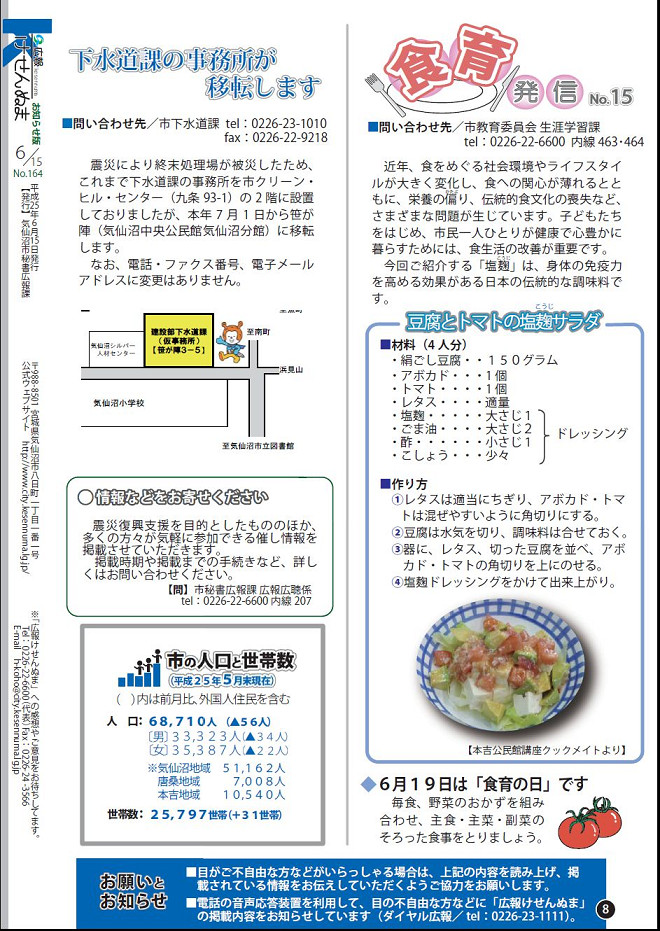 広報気仙沼に掲載 | 自分の書いた食育の記事が気仙沼市の全世帯に配らている「広報気仙沼」に掲載。本吉公民館の講座で作った塩麹サラダを紹介。発酵食品が身体の免疫力を高めるという事を知っていたので「塩麹」も免疫力も高める効果があるはず。ということを書いてみた。こんなんでいいのか。。 ![]() 15