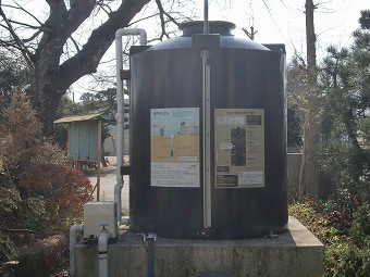 階上小学校にある防災倉庫とNPO寄贈の井戸
