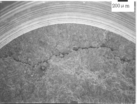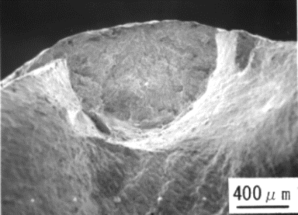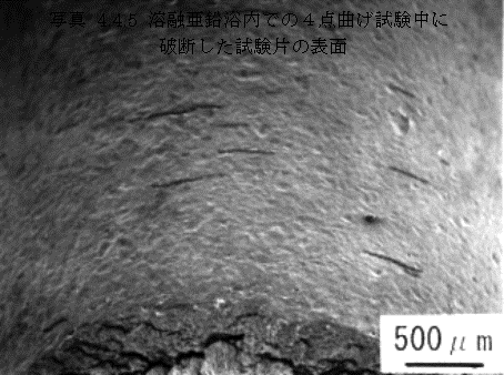 溶融亜鉛浴内で4点曲げ試験を行った試験片を、引張試験によって破断させ破面観察を行った。その結果、溶融亜鉛浴内での4点曲げ試験中に発生したき裂は、曲げ外側面に線軸に対して直角に発生しており、線表面に対して垂直に生じていた。また、写真4.3.1 に示すようにき裂は半円状の形をしており、試験片断面の中心に向かって放射状に進展していた。Rostokerらは10)適当な液体金属の存在下で固体金属が引張応力を受けるとしばしばぜい性的な破壊が観察され、多くの場合破壊は降伏点あるいは多少塑性変形した後に起こり、破壊面は巨視的には応力軸に垂直であると述べている。