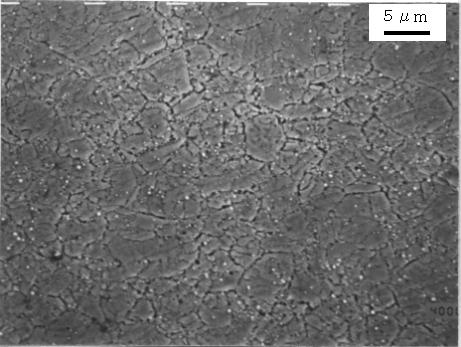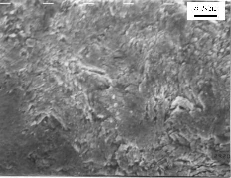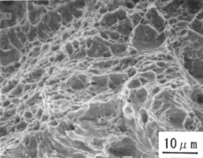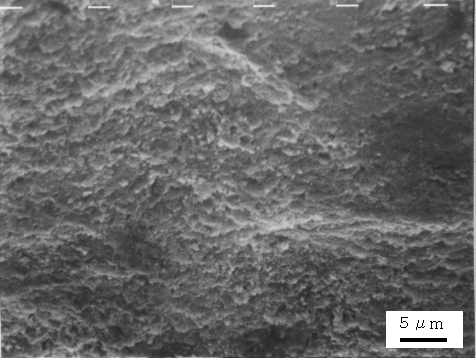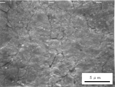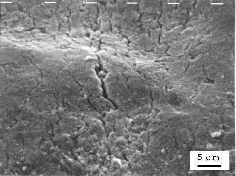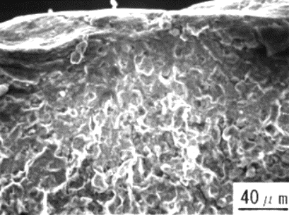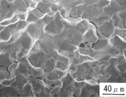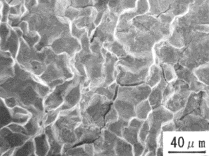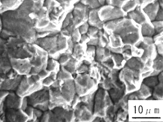SEMにより破面を観察したところ、溶融亜鉛浴内での曲げ試験で発生したき裂部は、写真4.3.2 のように粒界割れ破面を生じており、EPMAにより亜鉛の面分析を行ったところき裂部には亜鉛が付着していた。一方、溶融亜鉛浴内で4点曲げ試験後の引張試験によって破断した部分はディンプルからなる延性破面をしており、亜鉛の付着はなかった。これらの結果は、ボルト試験片での冷却過程で発生したき裂の破面観察結果と一致していた。15)〜18)