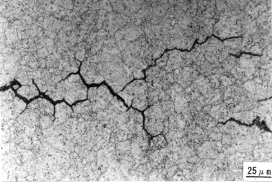 写真4.4.4は、き裂と粒界の選択的腐食の区別を明確に定義するため、Gh法により、オーステナイト結晶粒の粒度をしらべたものである。試験片の結晶粒の大きさと比較すると、結晶粒度は、試験片の結晶粒と一致していた。