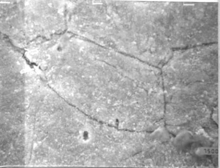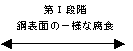 (a)は、曲げ外側の状態を示すものであるが、ここでは鋼表面がほぼ一様に腐食を受けていることがわかる。しかし、粒界の腐食は見られない。(b), (c)は中間付近、内側の状態であるが、ここにも同様に全面の腐食がみられる。これはき裂発生過程の第I段階の領域に入っており、断面の観察結果と一致する。この範囲は負荷の開始からたわみが20mm程度になるまでの間であり、試験片が多少塑性変形生じた付近であった。