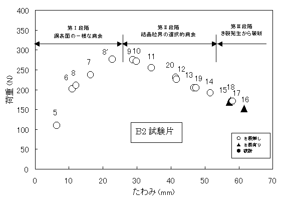 グラフ中の数字は、試験片の番号である。また、表中の×は、浴内で破断した試験片、き裂が発生した試験片を表す。