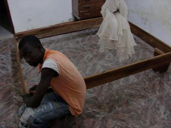 任地ティエスへ移動、初出勤 朝7:00に隊員連絡所を出発し、車で二時間の任地ティエスへ移動、先輩隊員と同居生活の始まりです。さっそく部屋の掃除を始めると停電、部屋は窓がないので意外と暗く、何も出来ない。しかも停電長い。家の中は屋根がない場所が二カ所あったり、トイレの水も出なかったり最初はちょっと大変かも。10:00になりマルシェに行きマットレスを買う、先輩の知り合いの家具屋にベット台を作ってもらいました。というよりたまたま完成品っぽいのがあったので良かった。家具屋といっても路上でやってる店で自分でも作れるような鋸と釘で作った簡単な家具ですが。マットラが80,000cfra(16,000円)で、ベッド台60,000cfra(12,000円)でした。蚊帳を立てる棒が欲しいと言ったら木を買ってくるとの事。5000cfraを渡してさっそく買ってきてもらい部屋の中で作ってもらいました。マルシェまでは歩いて15分くらいだけど先輩と二人でマットラを頭に載せて運んだりほんと大変でした。でも他の同期隊員はもっと厳しい場所に配属されて自分は恵まれてるほうです。 セネガルのお昼休みはだいたい12:00〜15:00なので15:00頃初出勤してきた。上司のNdiouckのところに行き話をした。といってもフランス語がほとんど聞き取れず、とりあえず明後日の10:00に自分の仕事についての院内会議をするから来てくれというのがわかったので了解です。勤務中どんな服が良いのか聞いてみたが、これも聞き取れず、なんとなく襟があったほうが良いのかと思い。帰りに古着屋でシャツを三枚5,000cfa(1,000円)で買ってきた。フランス語聞き取れるようになるのだろうか。。仕事なんてまだまだ厳しい状況です。 夕飯は先輩がすごい御馳走を作ってくれました。自分がキャベツが好きと言ったらキャベツ料理に、いろとりどりのサラダ、にわとり一匹を簡単にさばいてカラ揚げに。おれも覚えないとな。近くに住む先輩隊員と三人で我が家で自分のお祝いをしてくれた。先輩に感謝です、ありがとうございます。写真は先輩の知り合いで家具屋のアリューです。 ![]() |