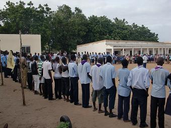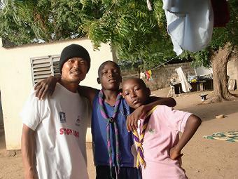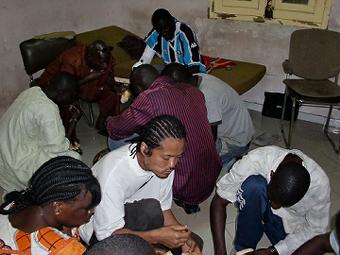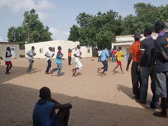 ボーイスカウトキャンプ二日目 朝は6時くらいに叩き起こされ全員整列して体系練習。このキャンプはトイレが二つしかないし、水も満足にないので、当然シャワーもなく、遠くからバケツで運んでトイレで水浴びです。蚊帳も満足にないのでぎゅうぎゅうづめの子供達の中に入り込んで寝ました。電話会社のストライキで電話も二日間通じない、自分は二日間しかいなかったけど、先輩は一週間いてウォロフ語しか使わない人達の中でがんばってました。傷の処置をしたり、手洗いの指導をしたり、すごいです。当然のように手でご飯を食べるのですが、食べる前に手洗いをするけど、バケツ一杯の水にみんなで手を突っ込むだけなので本当に衛生的に良くないです。 ![]() イスラムの教えを説くコーラン学校。もちろん勉強してるフリ。