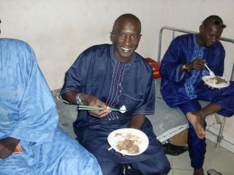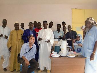 産婦人科訪問・日本食紹介 助産師の新隊員が語学訓練中にうちの病院を見に来た。産婦人科に入るには白衣着用が義務なので、自分も白衣を着る。というかメンテナンス部で作業するときにたまに着てる青衣だけど。。生まれたての赤ちゃんの耳をでかい針でぶちっと穴をあけて太い糸を入れたままにするんだけど。ちょー痛そう。。当然消毒綿を塗るが、消毒液ケースがいつも開いてるから乾いてるし。。 ![]() 日本食の紹介という事で牛丼を作っていきました。メンテナンス部は17人もいるから玉ねぎ30個くらい入れたかも。セネ食に煮た牛丼はセネガル人にちょーうけました。美味いってみんなに言われて満足。ふりかけはいまいちだったけどインスタントみそ汁が大人気。みんなに箸の使い方を教えて使えるようになると喜んでました。右の写真は箸でご飯を掴めるようになると写真を撮ってくれというAbdlay Sow。 ![]() 病院食を作ってるCuisineのChef(部長)「Omar」も来てくれて日本食も美味いな。って言われてかなり満足。その他もCuisineの他のメンバーや整形外科のメンバーも食べに来て30人分くらい作ったのにギリギリでした。 ![]() Dialloも箸を使う練習をしてご飯を掴めるまでになりました。最後にメンテナンス部のみんなで写真を一枚。