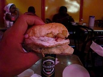 フィッシュバーガー 最近近くのレストラン「Delices」で食べる「魚バーガー」にはまってます。マックのフィレオフィッシュより美味いかも。休日で電気も水もないので今日もレストランへ。Wフィッシュバーガー1800fcfa(360円)、ちなみにシングルだと1500fcfa(300円) ![]() |