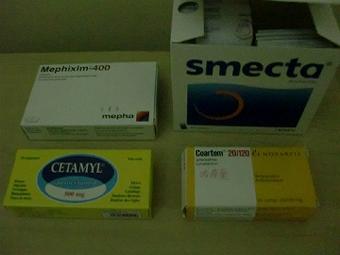 40℃の熱 高熱で隊員連絡所の療養室。初めて療養室に入ってしまった。血液検査をしたがマラリアではなかったので一安心。細菌が原因らしい。Paracetamol(解熱剤)・Mephixim(抗生物質)・Smecta(下痢止め)を購入し、飲む。Coartem(マラリア薬)は常に持ってなくてはならない薬です。 ![]() |