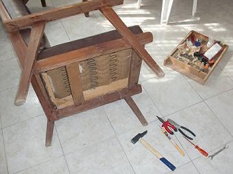 家補修 今日はタバスキ後の休日、家の修理。まず、外れていた肘掛椅子のバネをなおし、雨季で黄色くなった壁を削り、ちょこっと補修。また窓にいたヤモリを追い出し、ゴキブリが入りそうな穴をセメントで埋め、台所の穴を補修してるとネズミと対面、また逃がしてしまった。