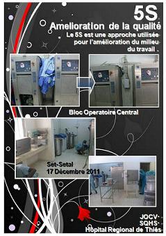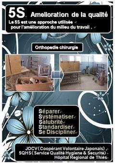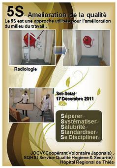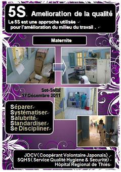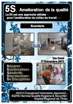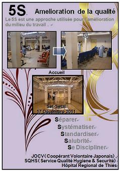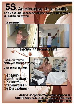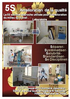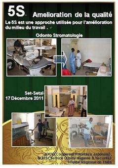 5s会議 全科のMajor(責任者)を呼んで院長主導による5s会議が行われた。内容の濃い会議であり、自分が提案したこともいくつかあるのでフランス語でもなんとか理解できる会議だった。院長がMajor全員順番に5s進捗状況を聞いて、17・18日は全職員で病院全部を清掃する事に決まり、これから本格的に取り込んでいく体制がやっと整った感じ。取り組み内容は外科:ゴミの分別、産科:ラベル付け・清掃・数字化・トイレの問題・カルテの問題、口腔外科:ゴミ・片付け、内科全:ゴミ、関心を持たせるための話し合い、救急:掃除婦に説明・実施・注射針の処理、血液銀行:引き出し等の整理・清掃、泌尿器科:毎日診察後の掃除、総合受付:注射針の処理、心臓科:診察カードの整理・清掃、薬局:薬の整理、しまう場所の不足、看護部長:関心を持たせる説明、等。いまいち良い意見が出ないので院長も苦笑い。会議後院長に呼ばれて何かと思ったら、Tシャツと帽子を500着作って5sの日にみんなで着ようとのこと。そのデザインを頼まれた(写真右) ![]() 今日も証明書写真に追われたが、Informaticien(コンピューター技師)のアリが一緒にやってくれることになった。