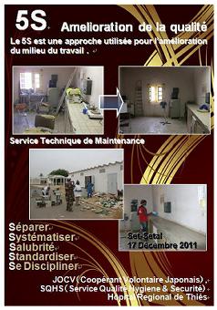 メンテナンス部内5s会議 来週末予定している病院内全清掃について院長から各部署に説明があり、メンテナンス部でも本日会議が行われ(写真左)、全員に土日出勤命令が出た。メンテナンス部長のマダムデューフも再度5sを説明し、Albert(自分)と一緒にやろう。と説明してくれて、来週末までに必要なものと不必要なものを皆で分けようと言ってくれた。かなり溜まってきたメンテナンス部前の壊れた機器を「清掃前」写真として撮った(写真右)今日は毎月末に質改善課長に提出するレポートをターラに見てもらいフランス語修正。その中の考察で、「きちんとした埋め立て施設があれば良いが、今のセネガル政府はきちんとした処理システムを作ることができるとは思えない。」と書いた文は気持ちは解るがセネガル政府(Gouvernement senegalais)と書くと問題があるから一般的なゴミ処理のシステムがない(Mais en l'absence d'un tel systeme de traitement d'ordures)に修正し、批判的な言い方は良くない、少しずつ良くする事が大事であり、それを強調した方が良いと言う。さすがターラだ。情報処理技術者のアリが明日も一緒に証明書バッジを作ろうと言ってきたが土曜は忙しいと言って断ったらちょっと寂しそうだった。。 ![]() |